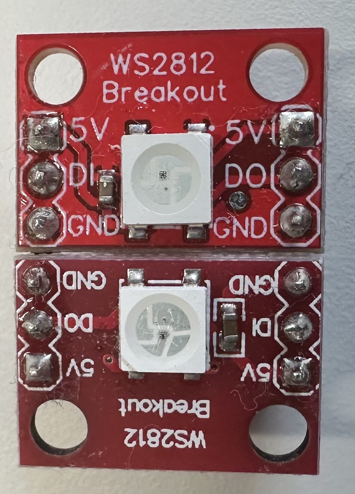 Auf dem Foto ist beim oberen Modul eine kleine Abweichung des Abstandes der Stiftleisten zueinander erkennbar.
