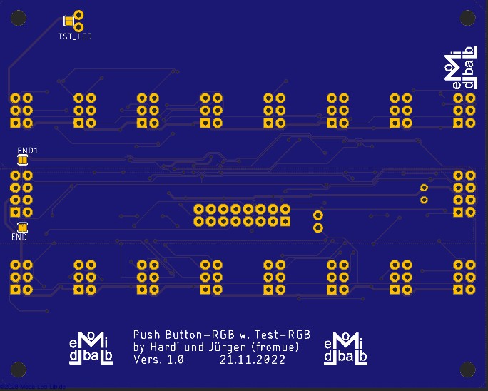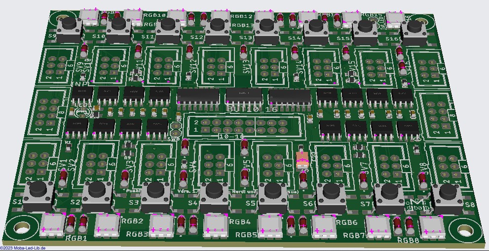 Diese Platine ist eine Überarbeitung/ Erweiterung der seitherigen Push-Button Action-Platine 4017. Sie ist für 16 Taster mit LED- oder RGB-Beleuchtung entwickelt worden.